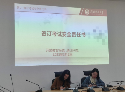 会议最后,肖对学院迎评各项工作做了部署安排。与学院所辖各考点负责人签订了“考试安全责任书”