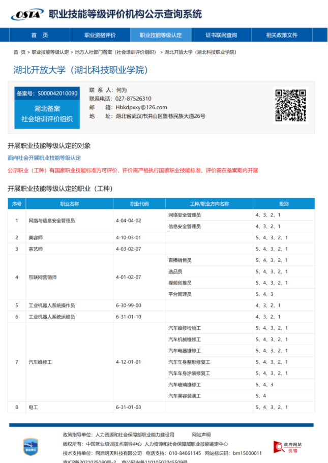 本网讯(通讯员 何为 /图)近日,经武汉市人社局评定、省人社厅审批、人社部备案,认定我校具备社会培训评价组织职业技能等级认定条件。至此,我校现已具备茶艺师、美容师等共8大类5个等级的职业技能等级认定职业(工种)的认定资格。