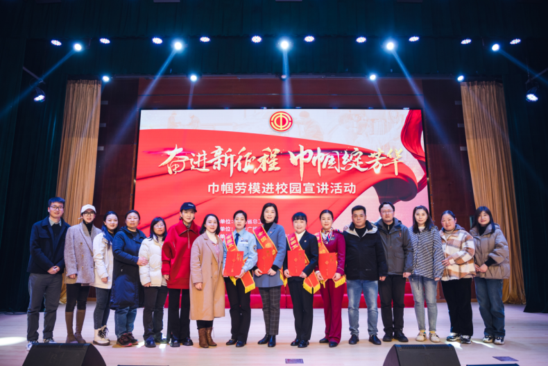 本网讯(通讯员 张颢蓝/文 沈雁君/图)神州自古赞巾帼,美誉娥眉响颂歌。3月21日下午,由湖北省总工会主办,我校协办的“奋进新征程 巾帼绽芳华——巾帼劳模进校园”宣讲活动走进校园,以“劳模宣讲+职工文艺宣讲”形式展开。校党委书记刘义、党委常委张化斌,省总工会党组成员、副主席刘建宇等出席活动并分别致辞。活动邀请了全国五一劳动奖章获得者王艳鸽,党的二十大代表、全国劳动模范周怡,党的二十大代表、全国劳动模范姚婕,全国五一巾帼标兵、全国“城乡社区抗疫巾帼先锋” 倪娟四位巾帼劳模走进校园,以“文艺+宣讲”的形式,为当代大学生上了一节别开生面的“大思政课”。学校师生400多人线下参与,并吸引35万多人次在线收看网络直播。