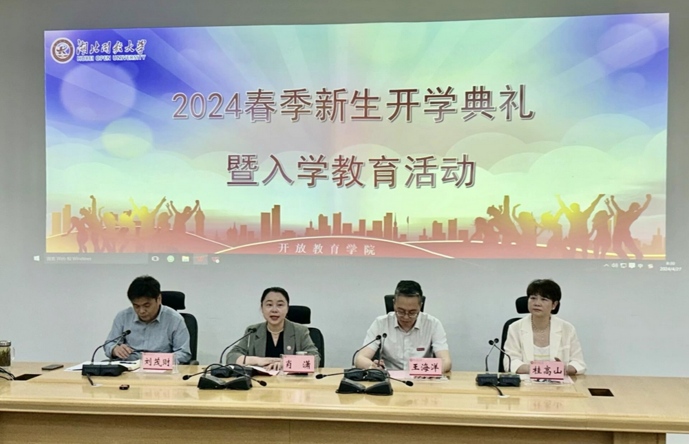 本网讯(通讯员 肖娟/文 沈雁君/图)4月27日上午,开放教育学院通过线上线下同步的方式,举行了2024年春季学期新生开学典礼暨入学教育活动。学院全体教职工和80名新生代表现场参加了活动,近1600名新生线上参会。开学典礼由院长肖潇主持。教务处处长王海洋、导学中心主任桂高山出席活动。