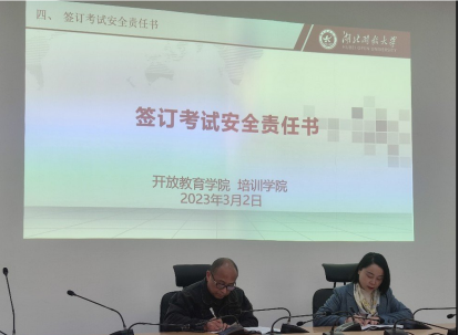 会议最后,肖潇对学院迎评各项工作做了部署安排。与学院所辖各考点负责人签订了“考试安全责任书”。