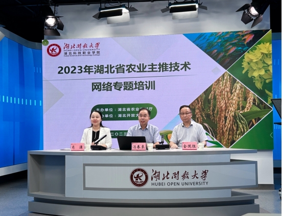 本网讯(通讯员陈霞/文 谭芬/图)9月26日下午,由湖北省农业农村厅主办,湖北开放大学承办的“2023年湖北省农业主推技术网络专题培训”第一期【再生稻丰产高效栽培技术】培训在我校鲁巷校区全景演播室顺利开班。省农业农村厅科技人才办公室副主任金国胜一行三人、湖北开放大学党委委员、副校长汤春来、导学中心主任桂高山、农学专业青年教师肖畅参加了开班活动,会议由开放教育学院、培训学院院长肖潇主持。此次培训班以线上直播形式开展。