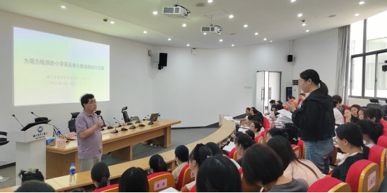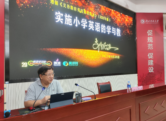 在本次结业典礼开始之前,首先由本次培训特聘专家、特级教师、原武汉教育科学研究院外语室主任、教育部《英语课程标准》研制组核心成员刘兆义老师为本次培训作主题为《遵循新课标实施小学英语学与教》的讲座。刘老以近八十岁的高龄,在讲台上激情澎湃的为参训学员讲授了基于新课标如何构建英语教育教学的蓝图,以及放眼未来数字教育的方向,为年轻的骨干教师们对新课标如何运用于教学指点迷津、指明方向。他对教育事业的热爱和对新事物勇于探索的精神也为参训学员彰显了榜样。